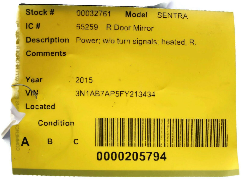 2013-2015 Nissan Sentra Passenger Right Side Power Door Mirror Black 32761